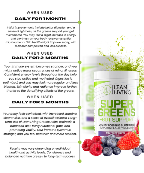Lean Living Super Greens + Gut Health is the ultimate daily vitality drink designed to supercharge your health. Packed with 9 powerful super greens, including high-concentration spirulina, it helps fortify your immune system and defend against viruses and bacteria.